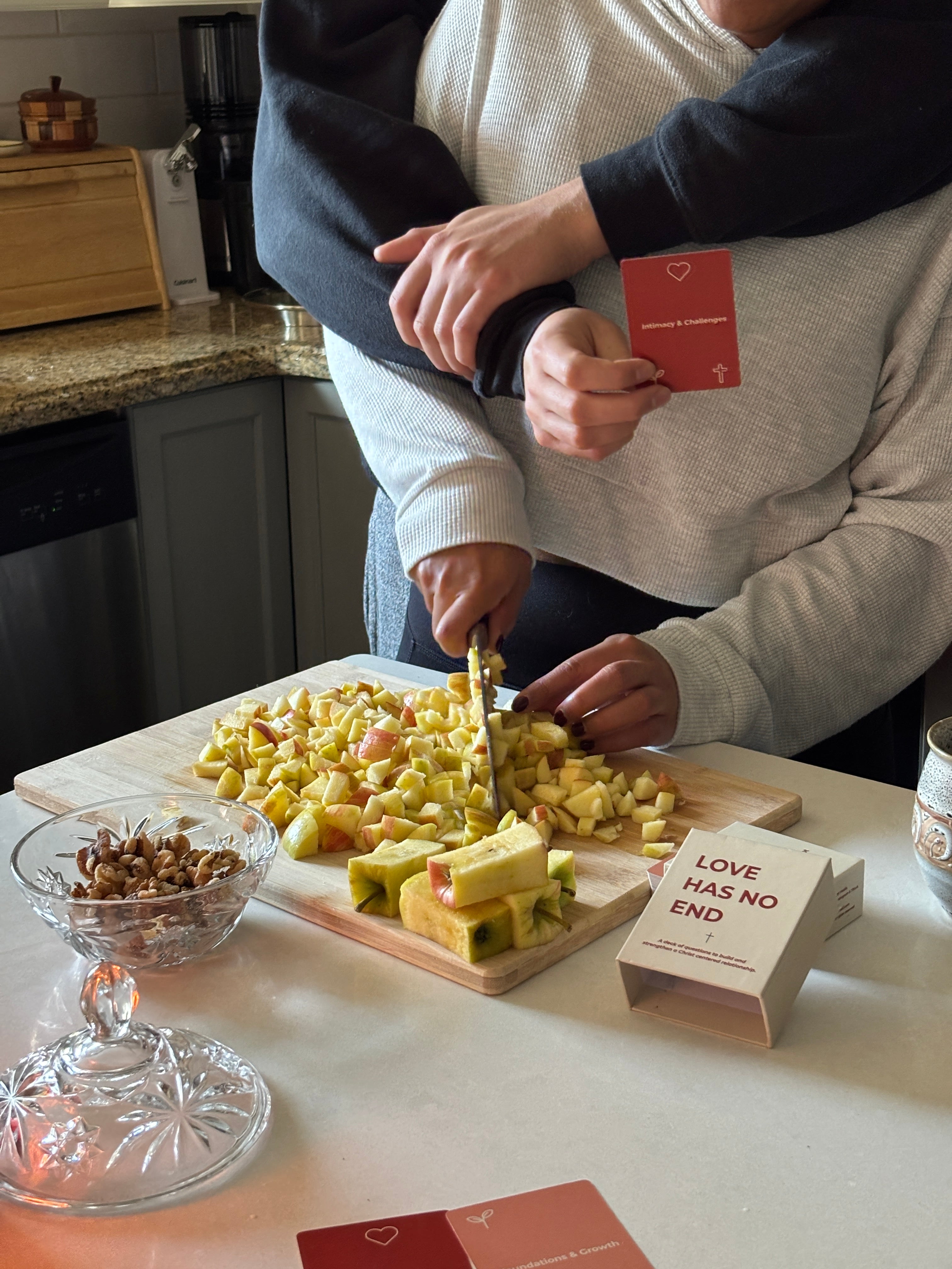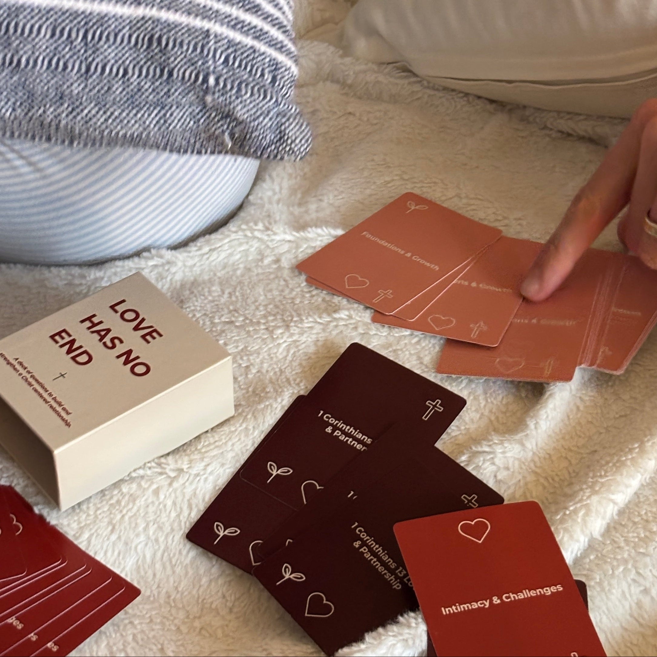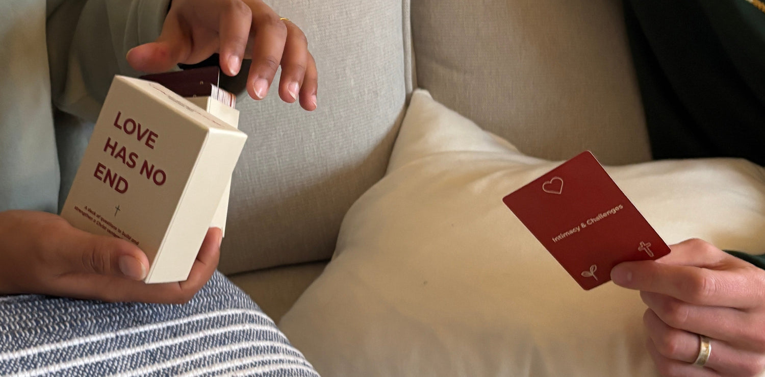 LOVE HAS NO END is a Christian relationship card game designed to help couples at any stage, grow closer to one another through thought-provoking questions. Couples are guided to reflect, share, and connect on a deeper level.